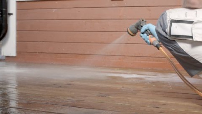 Start med at vaske overfladen med Terrassevask. Følg anbefalingerne på emballagen. Skyl rengøringsmidlet af med rigeligt vand. Hvis du bruger en højtryksspuler, skal du sørge for ikke at bruge for højt tryk, da det kan skade træet.