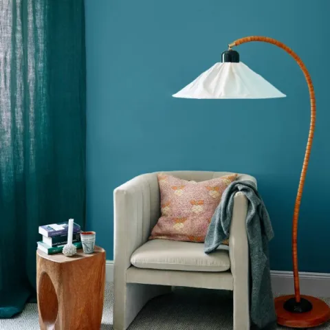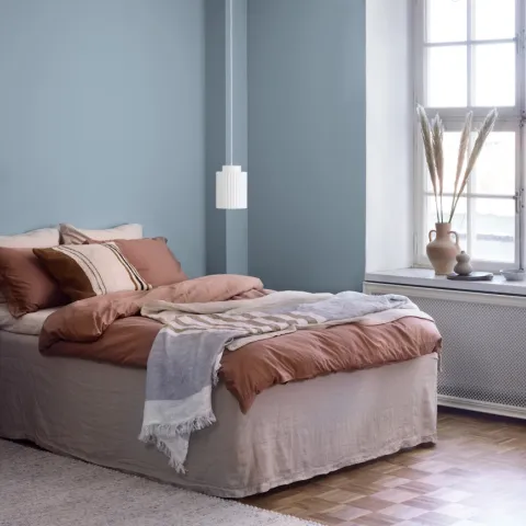 – Er den ikke fin? Farven. Jeg ville give rummet lidt karakter. Noget, som indretningsmæssigt var lidt sjovere end bare hvidt. Jeg har altid syntes godt om den her blå nuance, især i kombination med hvidt og brunt. Faktisk vævede jeg et stof i den farve, da jeg uddannede mig til kunsthåndværker for mange år siden. Det tog tid at finde den rigtige farve, og jeg testmalede nogle kvadratmeter dér mindst fire gange, siger Ann-Sofie og peger over mod stuens største væg.
