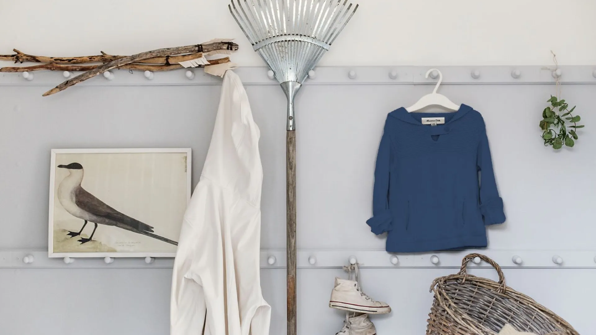 Kaos i entréen? Det kan lade sig gøre at skabe orden med farve. At matche gråt med hvidt slår aldrig fejl. Her har vi valgt at male to tredjedele af væggen i lysegrå Silverpil 732 og den øverste del i hvid Salt 564. Ved at male de dobbelte knagerækker i vægfarven kombinerer vi det praktiske med det æstetiske og tilfører entréen et mere roligt udtryk. Ganske enkelt en perfekt basis for alle andre farver på sko, jakker og alt det andet, som skal rummes i entréen.