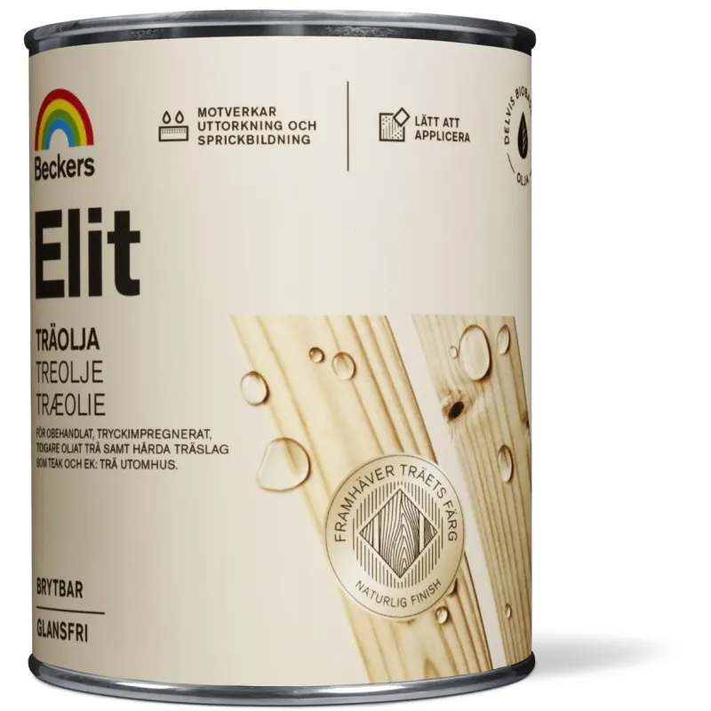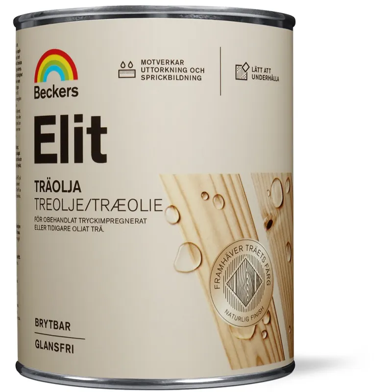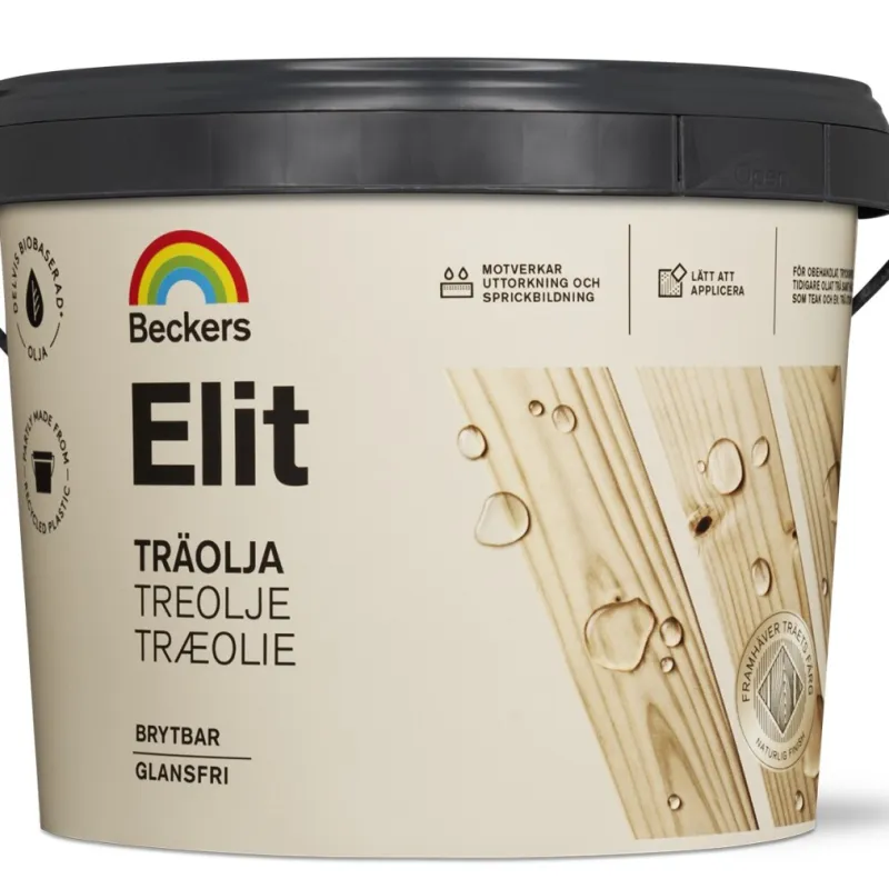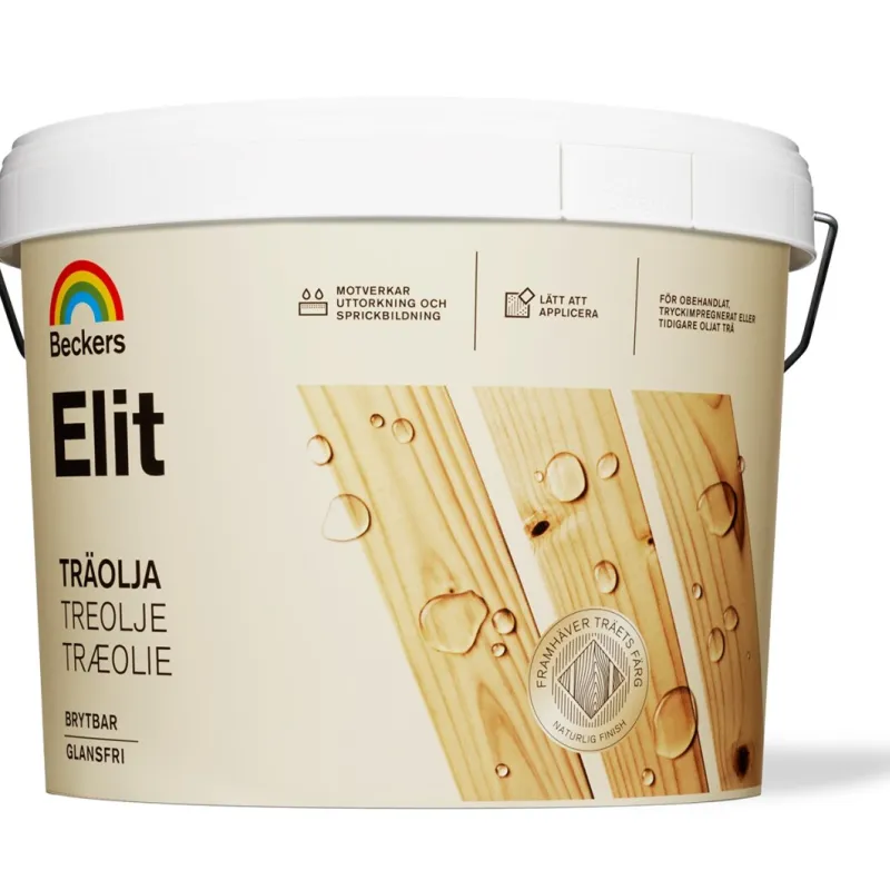 Hold træterrassen frisk og flot længere. Beckers Elit Træolie er en olie beregnet til årlig behandling af al slags ubehandlet, trykimprægneret eller tidligere olieret træ udendørs, såsom træbrædder, altaner og havemøbler. Elit Træolie er af højeste kvalitet, modvirker udtørring og dannelse af revner samt gør overfladen vandafvisende og let at vedligeholde.