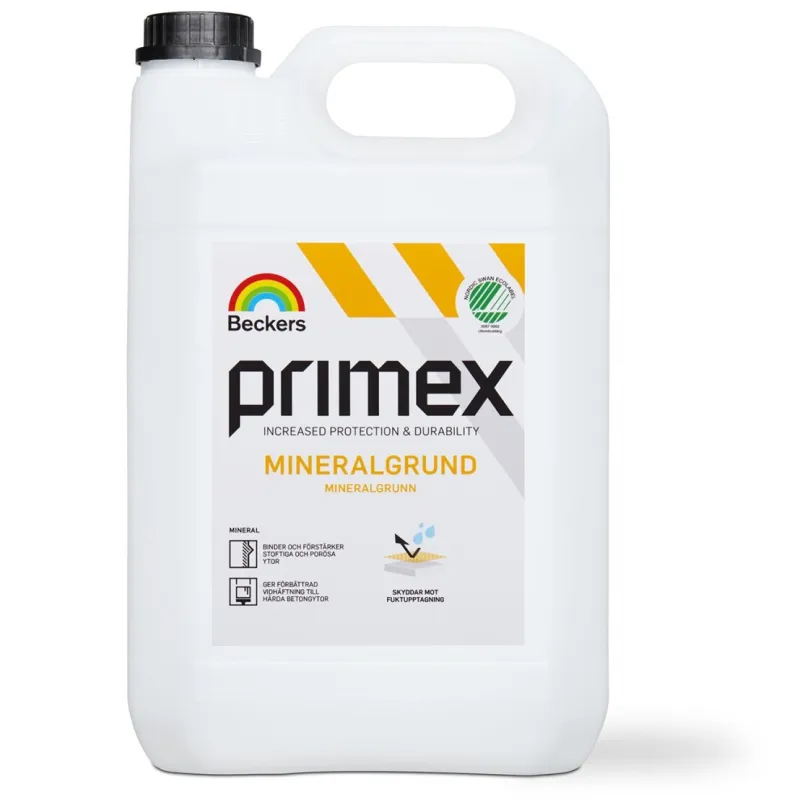 Beckers Primex Mineralgrund anvendes bl.a.som grunder på pudsfacader, hvor den binder og forstærker porøse og løse mineraloverflader. Mineralgrund hæfter godt på løse og porøse overflader samt hårde betonoverflader. Den forhindrer desuden underlaget i at optage fugt, og lader overfladen ånde, hvilket mindsker risikoen for frostsprængning. Beckers Primex Mineralgrund overmales med dækkende maling til mineralske overflader.