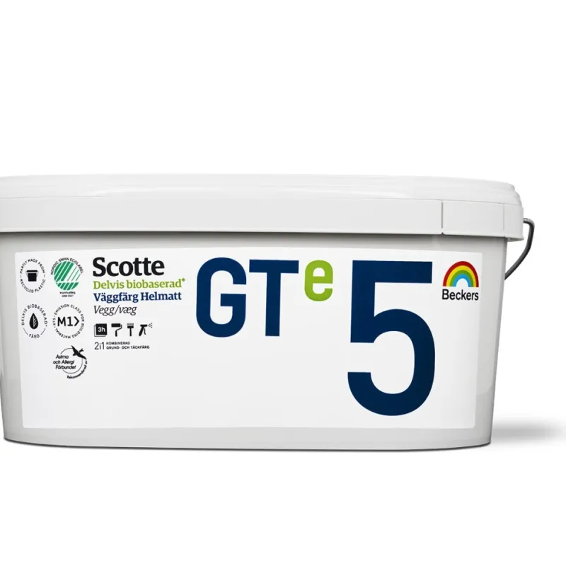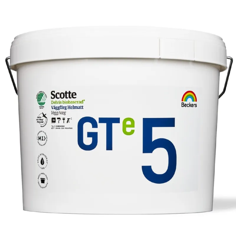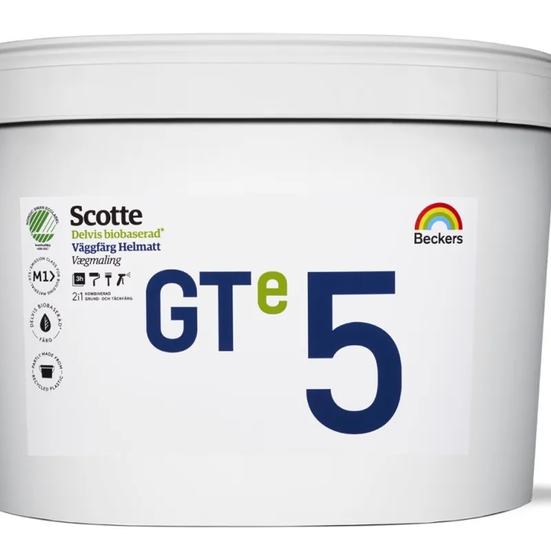 Nogle overflader har behov for at være mere robuste end andre. Beckers GT serie er derfor det oplagte valg, når der stilles høje krav til vaskbarhed og styrke. Scotte GTe 5 er en helmat akrylmaling med et meget højt teknisk niveau, der anvendes til vægge og lofter, hvor der stilles høje krav til det færdige resultat samt produktets påvirkning på miljøet, da produktet er delvist* biobaseret. Scotte GTe 5 er velegnet til maling af flader af sandspartel, puds, beton, træfiber-, spån- og gipsplader m.m. Vaskeklasse 1 iht. EN13300, hvilket gør den egnet til køkken, opgange, skoler o.lign. Biobaseret indhold: 30% iht. ASTM D6866-18